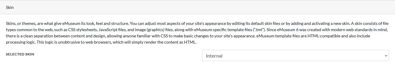 To apply a new skin, select it from the dropdown menu and save your changes. eMuseum will reload with the new skin applied, giving your site a refreshed appearance.