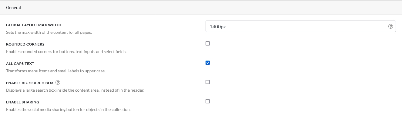The General section includes a set of fundamental appearance settings that affect your eMuseum site's overall layout and visual style. These options allow you to establish a consistent and appealing design that aligns with your brand or user preferences.