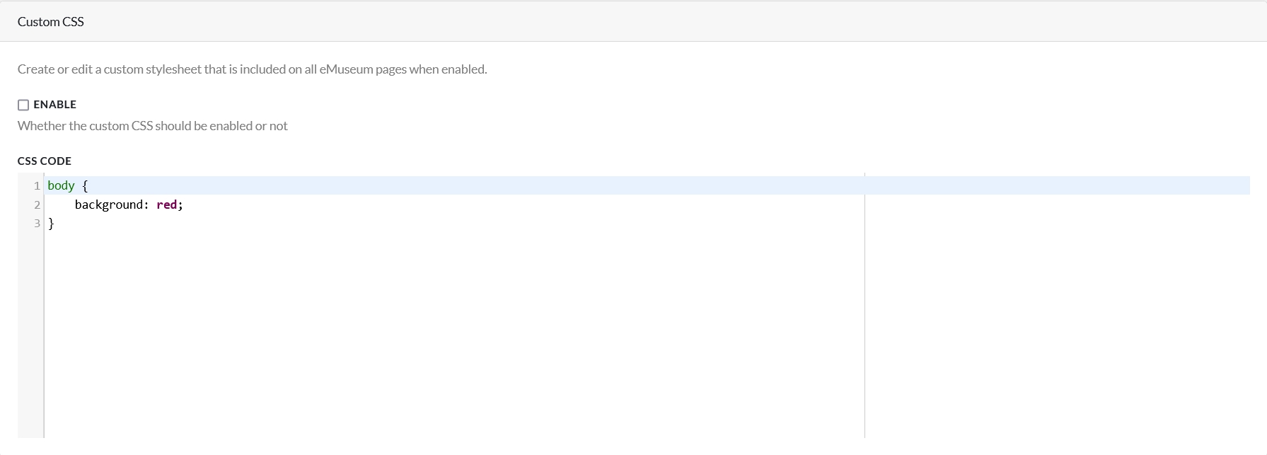The Custom CSS section allows you to create or edit a custom stylesheet that will be applied across all eMuseum pages when enabled. This feature provides advanced users with the ability to further customize the appearance of their application by directly modifying or adding CSS code.
