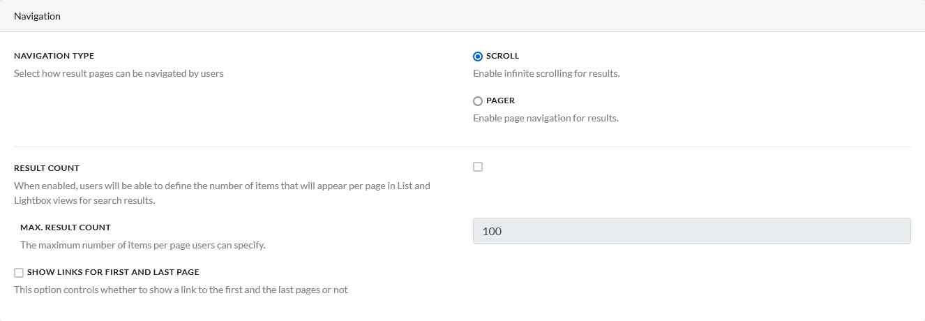 Select how result pages can be navigated by users. This setting determines whether users will scroll through results continuously or navigate through distinct pages.