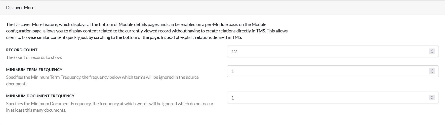 The Discover More feature enhances the user experience by displaying related content at the bottom of Module details pages. This feature can be enabled on a per-Module basis through the Module configuration page, allowing users to explore content related to the current record without manually creating relations in the TMS (The Museum System). The Discover More section provides options to control how related content is surfaced and displayed.