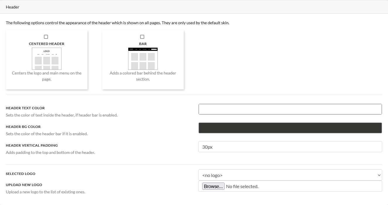 The Header section allows you to control the appearance and layout of the header, which is shown at the top of all pages. These options are only used by the default skin and play a crucial role in establishing the first impression of your site.